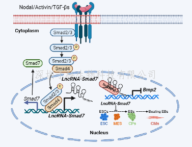 图:Nodal信号通路转录激活长链非编码RNA lncRNA-Smad7的表达,lncRNA-Smad7结合在Bmp2的启动子区,抑制Bmp2的转录表达,进而调控小鼠胚胎干细胞向心肌细胞的分化过程。