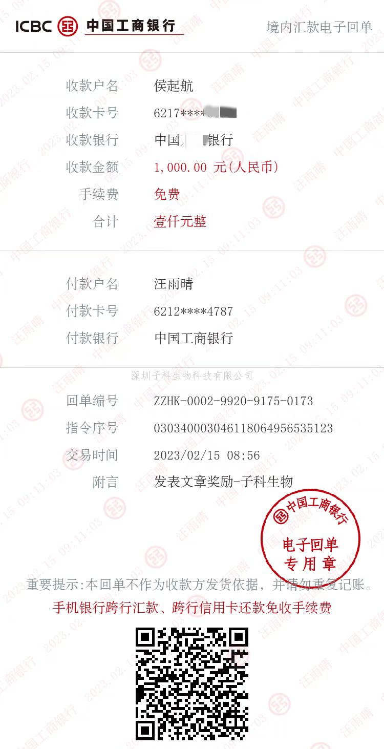 中国农业大学侯老师为第一作者,因为发布的高分文章,所以获得最高1000元奖励,奖金已经如期发放哦!