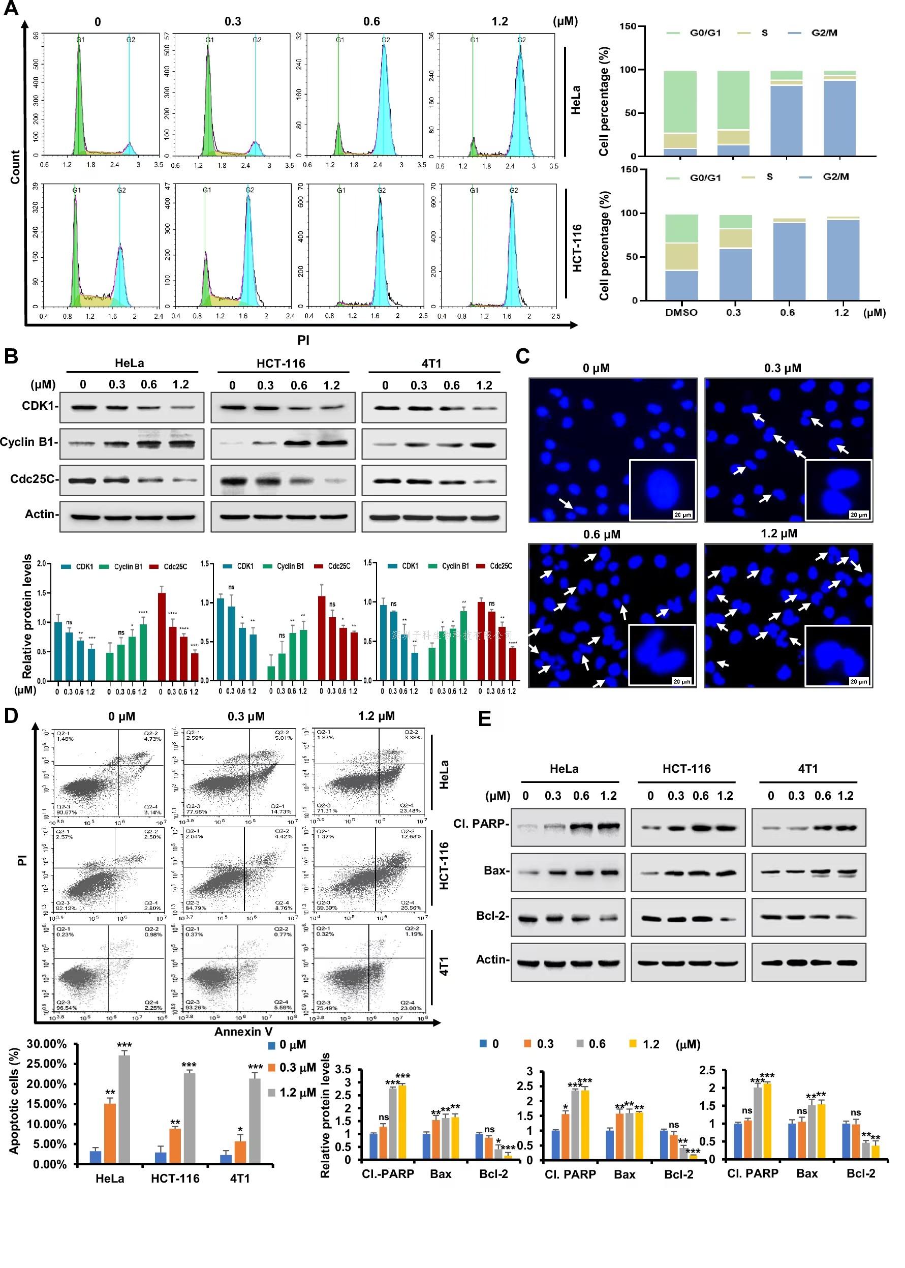 化合物89可诱导肿瘤细胞G₂/M期阻滞,上调cyclin B1,下调CDK1和Cdc25c,且Hoechst 33342染色显示M期细胞积累。它还能显著增加凋亡细胞比例,上调促凋亡蛋白,下调抗凋亡蛋白。