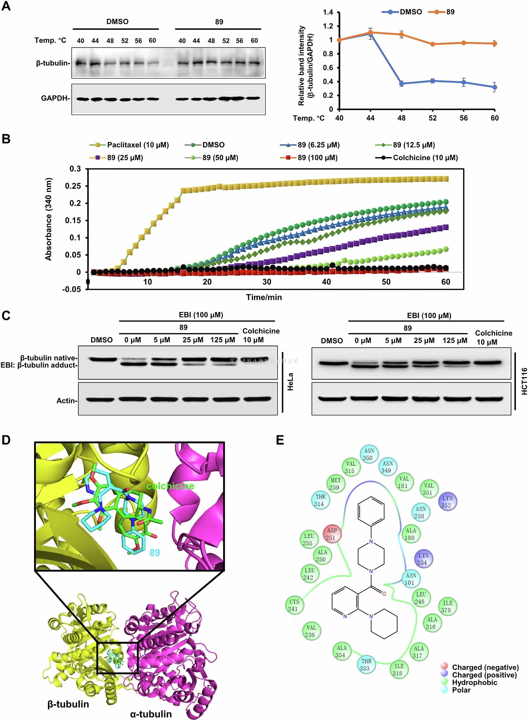机制研究表明,化合物89是秋水仙碱位点微管蛋白聚合抑制剂。CETSA实验证明其与β-微管蛋白直接结合,体外聚合实验显示其类似秋水仙碱能抑制聚合,EBI竞争结合实验和分子对接证实其与秋水仙碱位点的特异性结合及相互作用。