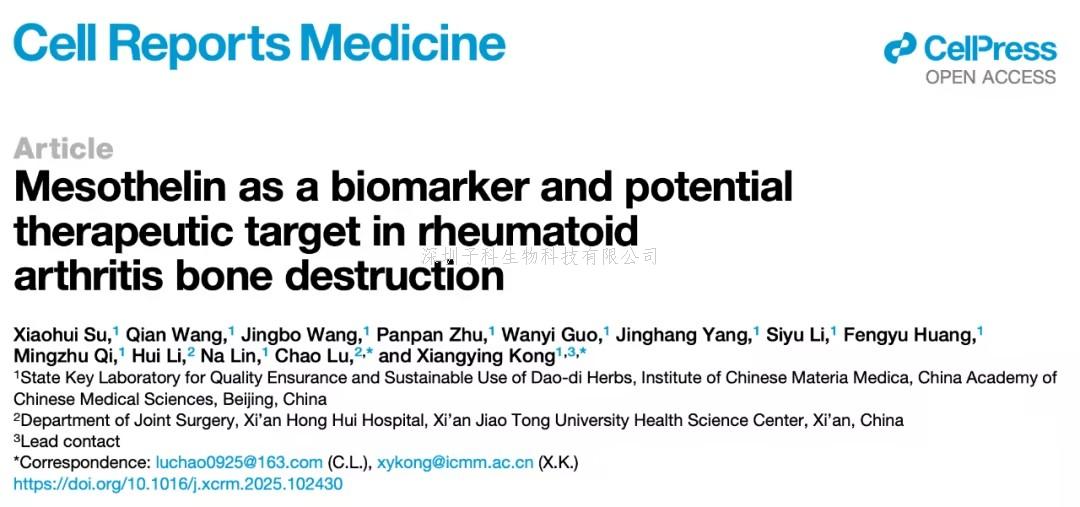 2025 年 11 月4 日,中国中医科学院孔祥英研究员、西安交通大学/西安市红会医院鲁超医生,在 Cell 子刊 Cell Reports Medicine 上发表了题为:Mesothelin as a biomarker and potential therapeutic target in rheumatoid arthritis bone destruction 的研究论文。