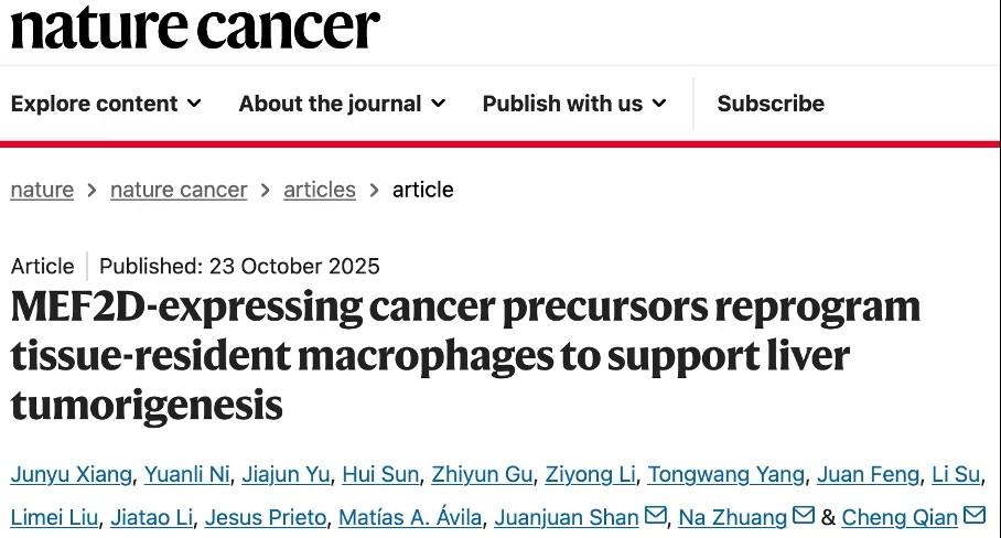 [1].Xiang J, Ni Y, Yu J, et al. MEF2D-expressing cancer precursors reprogram tissue-resident macrophages to support liver tumorigenesis. Nat Cancer. Published online October 23, 2025. doi:10.1038/s43018-025-01059-1