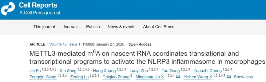 2026年1月11日,浙江大学汪以真、靳明亮共同通讯在Cell Reports 在线发表题为METTL3-mediated m6A on nascent RNA coordinates translational and transcriptional programs to activate the NLRP3 inflammasome in macrophages的研究论文。