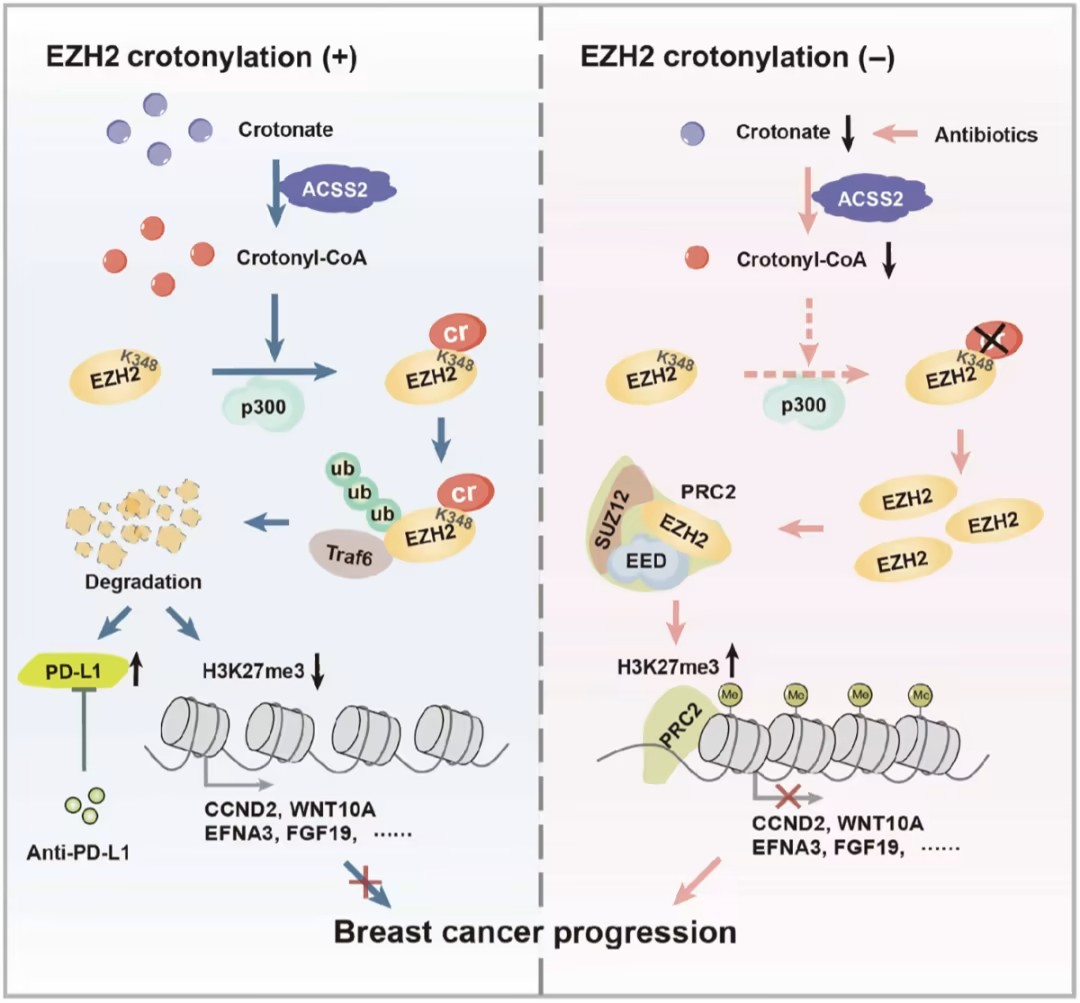 在这项最新研究中,研究团队揭示了一条通过巴豆酸-巴豆酰辅酶 A-EZH2 蛋白 K348 位点巴豆酰化(EZH2-K348cr)级联反应抑制乳腺癌生长与转移的新通路。