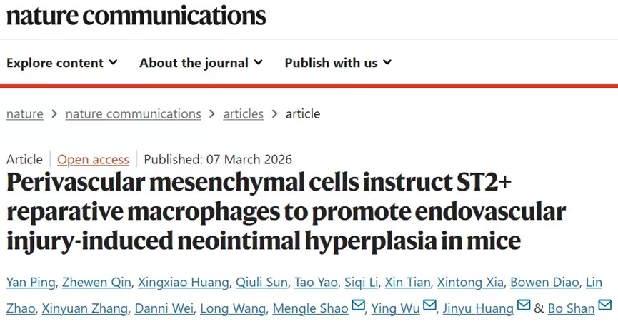2026年3月7日,浙江大学闪波、杭州市第一人民医院黄进宇、浙江中医药大学吴颖、中国科学院邵孟乐共同通讯在Nature Communications在线发表题为“Perivascular mesenchymal cells instruct ST2+ reparative macrophages to promote endovascular injury-induced neointimal hyperplasia in mice”的研究论文。本研究利用小鼠血管内损伤模型,证实血管周间充质基质细胞可通过招募表达ST2的修复型巨噬细胞,增强雄性小鼠动脉的免疫应答。
