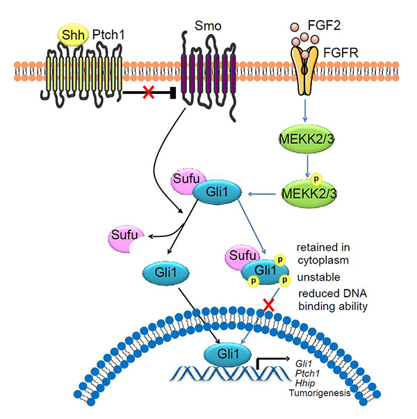 这项研究揭示了FGF2通过MEKK2/3对Hh信号通路进行抑制,并阐明了其中分子机理,为依赖于Hh信号通路的肿瘤治疗提供了全新的理论基础。