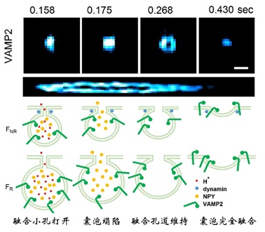 例如,在观察细胞内囊泡与细胞质膜融合释放神经递质和激素过程中,海森结构光显微镜与STED显微镜(分辨率60纳米,每秒5幅左右;巫凌钢实验室2018年3月Cell上线的文章)都可以观察到囊泡融合形成的孔道;但是,海森结构光显微镜还解析出囊泡融合时四个不同中间态,包括囊泡打开3纳米小孔、囊泡塌陷、融合孔道维持和最后的囊泡与细胞质膜完全融合的过程,真正可视化膜孔道形成的全过程。
