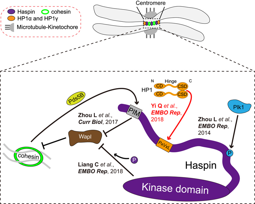 哺乳动物的HP1包含HP1-alpha、HP1-beta和HP1-gamma三种亚型。利用CRISPR/Cas9基因编辑技术,汪方炜实验室在体外培养的人体细胞中实现了对HP1三种亚型的单独或两两组合敲除,进而发现HP1-alpha和HP1-gamma对于着丝粒区染色体的粘连发挥着相互冗余的保护作用。通过在HP1-alpha和HP1-gamma双敲除细胞中回补野生型或突变体HP1-alpha,易琦和陈亲富等证实HP1羧基端的结构域Chromoshadow domain(CSD),而不是氨基端结构域Chromodomain与甲基化H3K9的结合,对于HP1保护染色体粘连是重要的。进一步的机理研究发现,HP1的CSD与蛋白激酶Haspin(汪方炜实验室的前期研究已鉴定该蛋白为cohesin的保护因子)氨基端的PxVxL motif相结合,促进Haspin在着丝粒区的定位,从而抑制cohesin负调节蛋白Wapl介导的粘连去除。这些实验结果揭示了着丝粒区异染色质对于姐妹染色体粘连的重要性,并阐明了异染色质蛋白HP1通过Haspin保护cohesin的分子机制。