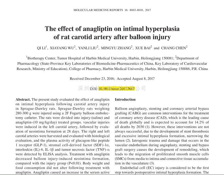 文章标题:The effect of anagliptin on intimal hyperplasia of rat carotid artery after balloon injury